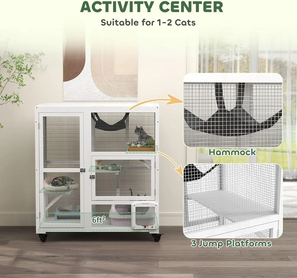 Indoor Wooden Catio, Cat House Cat Enclosure on Wheels with 3 Platforms, Hammock, Cat Flap Door & Openable Top